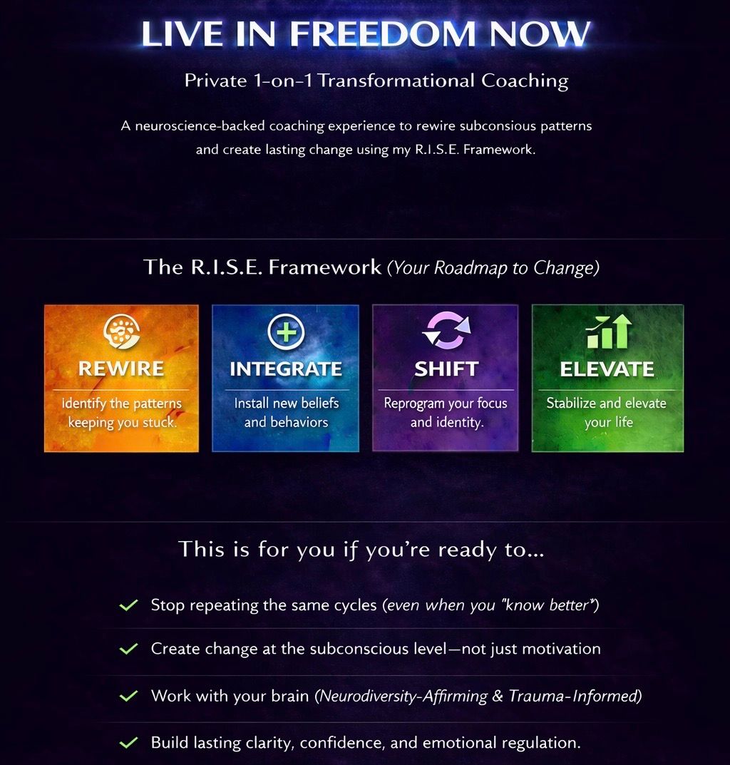 Live In Freedom Now is my signature online course designed to help you break free from the patterns that keep you stuck - mentally, emotionally, and in everyday life. Using my proven R.I.S.E. Framework (Rewire, Integrate, Shift, Elevate), you'll follow clear step-by-step process to retrain your brain, regulate your nervous system, rebuild your identity and create lasting change from the inside out. This course is perfect for anyone ready to stop surviving on autopilot and start living with clarity, confidence, peace, and true personal freedom.